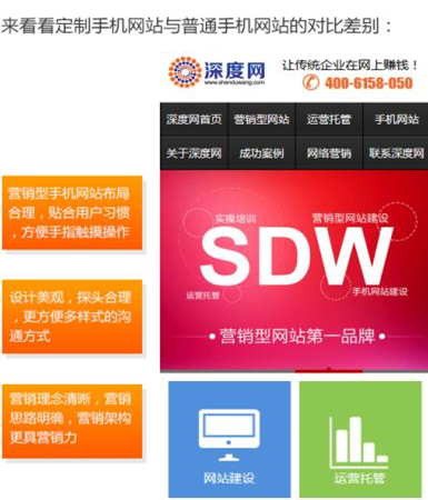 隨著“互聯網+”時代的到來,全網營銷已經變得非常重要,你是否也想讓你的企業在網上發展更快更強大呢?深圳市深度網專業營銷型網站建設公司,從成立之初一直專注于營銷型網站建設,營銷型手機網站建設,不斷為傳統企業打造網絡快速賺錢機器,為不少企業贏得了搶占網絡市場的先機。深度網全國免費咨詢熱線:400-615-8050或者